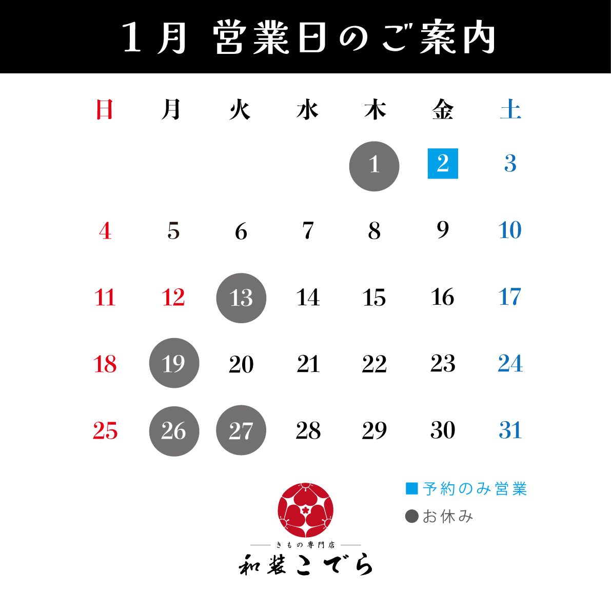 お知らせ NEWS 1月営業日のお知らせ 日時 2026年01月01日(木)~2026年01月31日(土) ●年末年始休業:大晦日・元日 ●1月2日(金)は予約のみ営業 ●1月3日(土)~12日(月)まで:新春振袖大商談会開催 ●1月14日(水)~2月1日(日):新春大振袖展第2弾 Prev NEWS & EVENTS TOP Next
