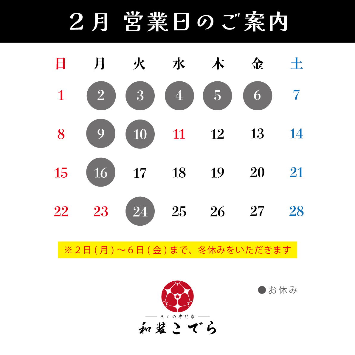お知らせ NEWS 2月営業日のお知らせ 日時 2026年02月01日(日)~2026年02月28日(土) 誠に勝手ながら、2月2日(月)~6日(金)までお休みとさせていただきます。 Prev NEWS & EVENTS TOP